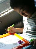 おばあちゃんにもらったばかりのおもちゃでひろびろ空間を満喫中。